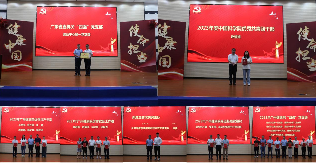專題報告后舉行了新黨員入黨宣誓儀式,全體參會黨員重溫了入黨誓詞,表彰了獲得中國科學(xué)院共青團(tuán)優(yōu)秀干部和廣東省直“四強(qiáng)”黨支部等榮譽(yù)的先進(jìn)個人和集體、廣州健康院“兩優(yōu)一先”和“四強(qiáng)”黨支部,為新成立的貝時璋科技攻關(guān)團(tuán)隊授牌。