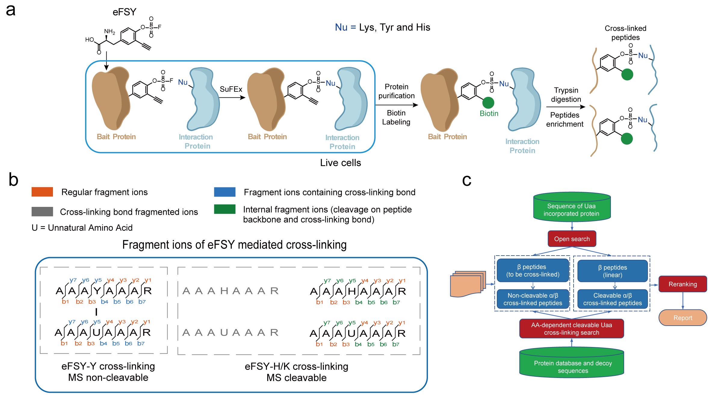 圖1?新型含氟磺酸基團(tuán)的可富集化學(xué)交聯(lián)劑eFSY研究蛋白質(zhì)相互作用時(shí),鑒定交聯(lián)肽段的流程圖(a),交聯(lián)肽段的碎裂規(guī)律(b)和交聯(lián)鑒定軟件AixUaa的開發(fā)流程(c)