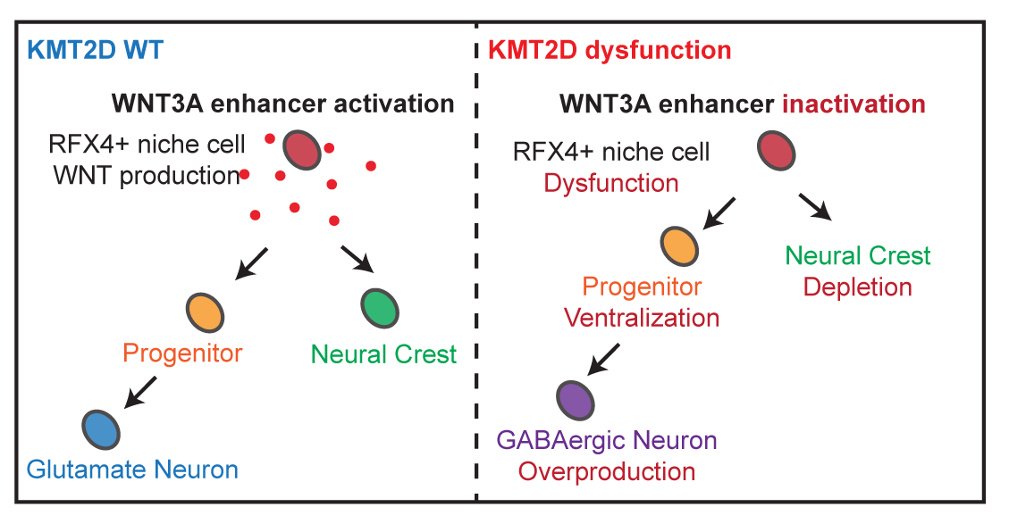 研究團隊利用人胚胎干細(xì)胞以及KABUKI綜合征患者家系iPS細(xì)胞,建立含神經(jīng)嵴的類腦器官分化模型。研究發(fā)現(xiàn)KMT2D失活后,Roof plate樣細(xì)胞無法正常激活WNT3A的核心增強子,微環(huán)境WNT信號活性不足,從而導(dǎo)致神經(jīng)干細(xì)胞提前分化且異常傾向抑制性神經(jīng)元譜系方向,同時導(dǎo)致神經(jīng)嵴譜系分化障礙;進一步通過WNT3A增強子敲除的人胚胎干細(xì)胞模型和?Kmt2d?突變小鼠模型驗證了這一結(jié)論,同時在KMT2D-KO類腦器官的分化培養(yǎng)中添加WNT信號通路激動劑或WNT3A蛋白,成功在類器官水平上挽救了該疾病表型。