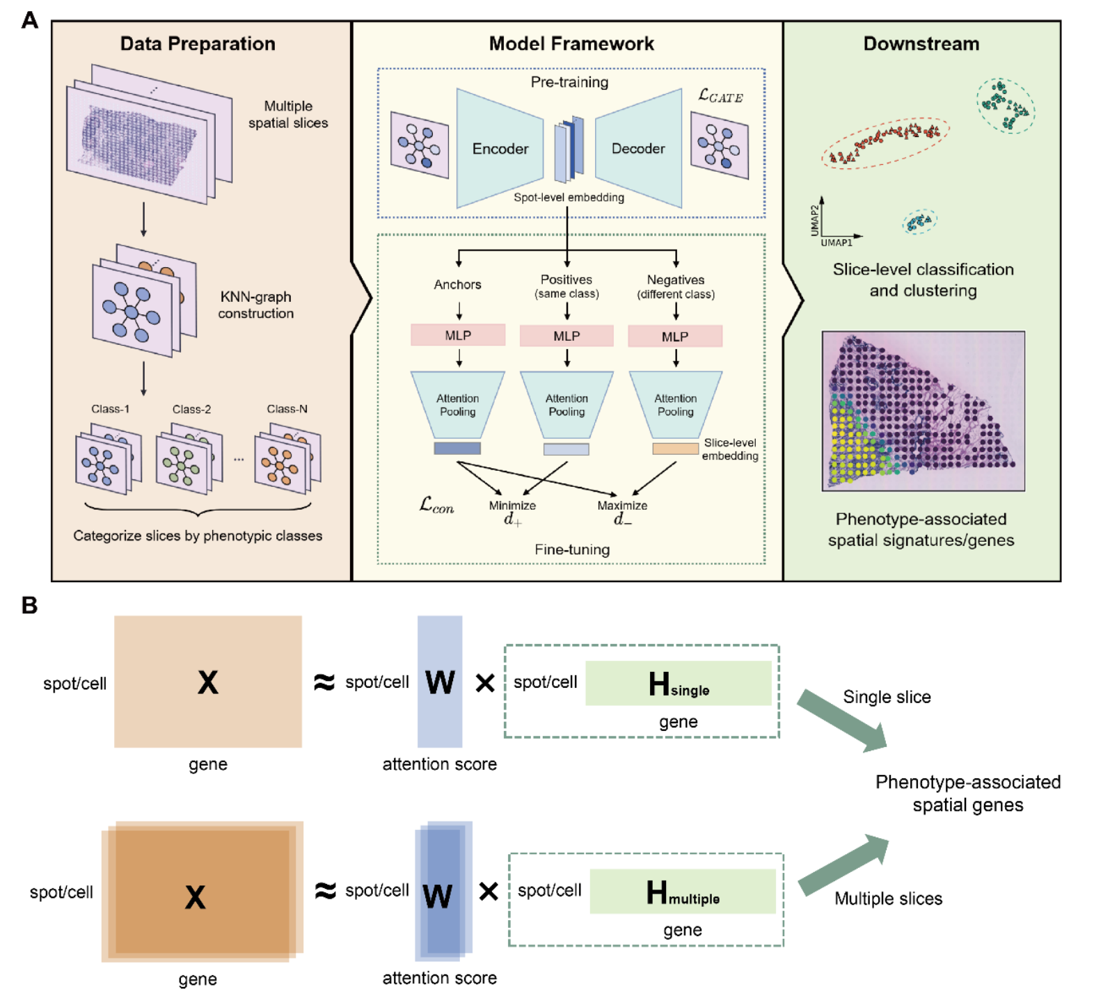 當(dāng)前的一些計(jì)算方法主要關(guān)注于單個(gè)或數(shù)個(gè)切片中細(xì)胞級(jí)別特征,對(duì)大量空間轉(zhuǎn)錄組學(xué)切片數(shù)據(jù)處理的效能不足。有別于此,PASSAGE提出基于多層次注意力的大規(guī)模異構(gòu)空間組學(xué)表征方法,從空間組切片(slice)、細(xì)胞與分子多個(gè)層次進(jìn)行不同粒度的表征學(xué)習(xí)與解析,有效增強(qiáng)了計(jì)算效率和可擴(kuò)展性。具體來(lái)說(shuō),PASSAGE在基于圖注意力自編碼器的細(xì)胞級(jí)表征基礎(chǔ)上設(shè)計(jì)了注意池化層(attention pooling layer),將同一切片的所有細(xì)胞加權(quán)融合成切片級(jí)表征,而后通過(guò)由表型信息指導(dǎo)的對(duì)比學(xué)習(xí)策略對(duì)切片級(jí)表征進(jìn)行優(yōu)化,并進(jìn)而采用非負(fù)矩陣分解方法獲得基因級(jí)別的注意力分?jǐn)?shù),從而實(shí)現(xiàn)對(duì)特定表型關(guān)聯(lián)空間組學(xué)特征的有效解析(圖1)。