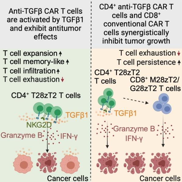 研究團(tuán)隊(duì)研發(fā)了一款新型靶向TGFβ的CAR-T細(xì)胞(T28zT2 T細(xì)胞),通過(guò)中和TGFβ信號(hào)逆轉(zhuǎn)腫瘤微環(huán)境中的免疫抑制,并展現(xiàn)出顯著的抗腫瘤潛力。研究發(fā)現(xiàn),CD4+?T28zT2細(xì)胞在TGFβ1刺激下可在血液和腫瘤中長(zhǎng)期存活,并分泌Granzyme B和IFN-γ直接殺傷腫瘤;而CD8+?T28zT2 T細(xì)胞則未顯示同等抗腫瘤效應(yīng)。進(jìn)一步分析表明,腫瘤浸潤(rùn)的CD4+?T28zT2細(xì)胞高表達(dá)TCF-1、IL7R和CXCR3,呈現(xiàn)記憶樣T細(xì)胞特征,同時(shí)上調(diào)NKG2D并降低PD-1/LAG3等耗竭標(biāo)志物,顯著增強(qiáng)其抗腫瘤活性。此外,CD4+?T28zT2細(xì)胞能夠重塑腫瘤微環(huán)境,協(xié)同增強(qiáng)靶向GPC3或MSLN的CD8+?CAR-T細(xì)胞的抗腫瘤能力,呈現(xiàn)倍增效應(yīng)。