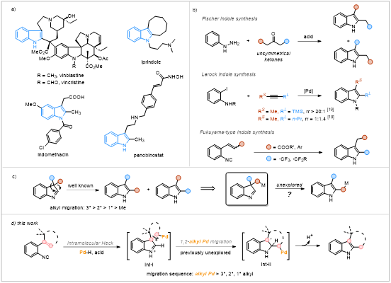 2,3-二烷基吲哚廣泛存在于各類天然產(chǎn)物及生物活性藥物分子當中。然而,在眾多的吲哚合成方法中,相較于芳基取代的吲哚,區(qū)域選擇性合成2,3-二烷基吲哚則要困難得多。例如,經(jīng)典的Fisher吲哚合成在使用非對稱的酮作為底物時,常面臨區(qū)域選擇性的問題,導致產(chǎn)物難以分離。Larock吲哚合成雖然在一定程度上解決了區(qū)域選擇性的問題,但僅限于炔烴兩端的取代基位阻差異較大的情況下,并會使位阻較大的取代基保持在吲哚的C-2位。Fukuyama-type吲哚合成由自由基啟動,可區(qū)域選擇性構(gòu)建2,3-二烷基吲哚,但自由基前體的種類往往較為局限。因此開發(fā)新型的2,3-二烷基吲哚的區(qū)域選擇性合成方法仍然十分迫切。