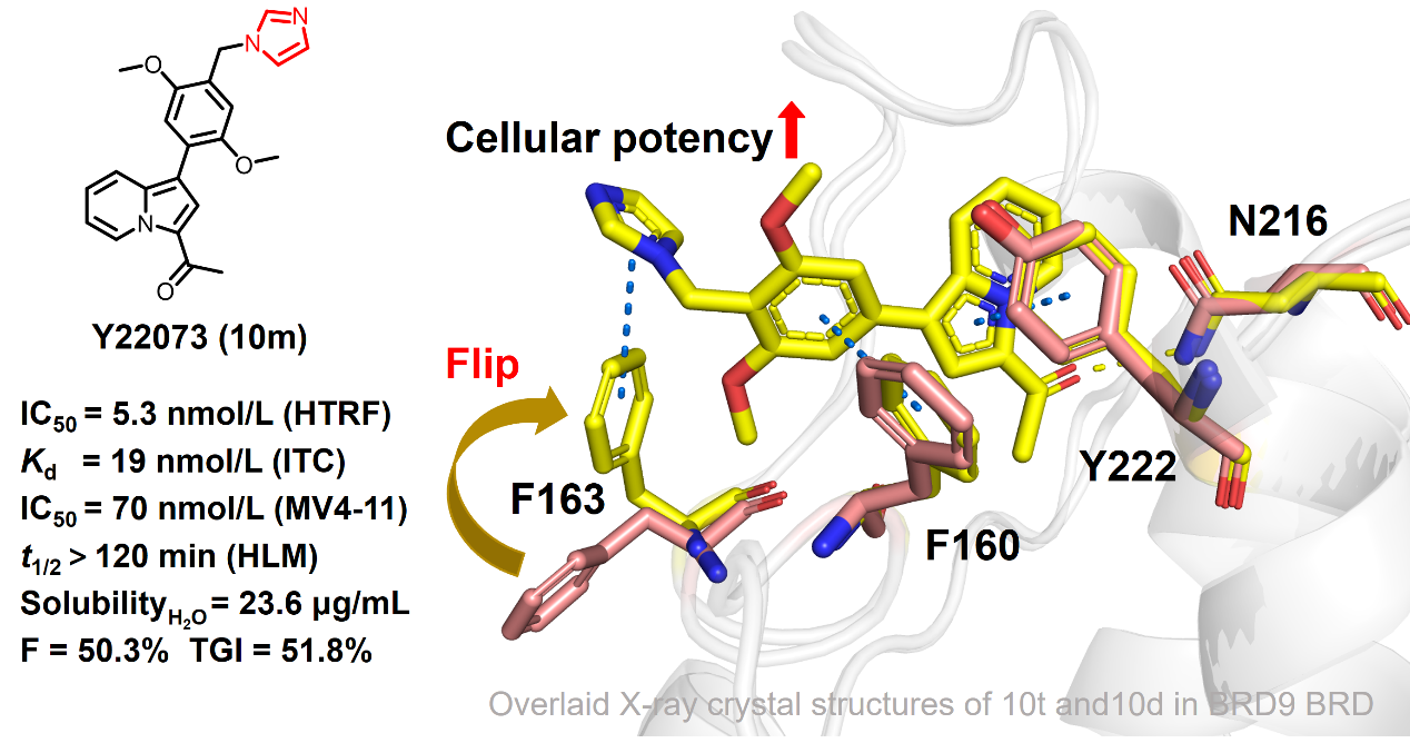 針對溴結(jié)構(gòu)域家族蛋白結(jié)構(gòu)高度相似導(dǎo)致的抑制劑選擇性難題,團(tuán)隊(duì)通過優(yōu)勢骨架化合物庫篩選、晶體結(jié)構(gòu)解析以及基于結(jié)構(gòu)的藥物設(shè)計(jì),成功開發(fā)出可用于AML治療的新型BRD9選擇性溴結(jié)構(gòu)域抑制劑Y22073。研究人員從基于結(jié)構(gòu)活性關(guān)系(SAR)的優(yōu)化策略中發(fā)現(xiàn)了咪唑類化合物具有卓越的體外抗增殖活性。合作團(tuán)隊(duì)通過X射線晶體結(jié)構(gòu)解析(分辨率最高達(dá)1.78 ?)精準(zhǔn)捕捉到BRD9的ZA通道存在一個獨(dú)特的“可調(diào)控開關(guān)”——Phe163翻轉(zhuǎn)開關(guān)。抑制劑中關(guān)鍵的咪唑藥效基團(tuán)能夠誘導(dǎo)BRD9蛋白的Phe163殘基翻轉(zhuǎn)并與其形成穩(wěn)定的π-π相互作用。然而,其他溴結(jié)構(gòu)域(如BRD7、BRD4、CECR2)中對應(yīng)位置的殘基無法與咪唑基形成有效相互作用,直接證明了該機(jī)制的特異性。這一分子層面的突破性發(fā)現(xiàn)不僅顯著提升了化合物的體外活性,也使得Y22073成為首個在AML模型中展現(xiàn)明確疾病表型干預(yù)能力的BRD9抑制劑。研究團(tuán)隊(duì)還創(chuàng)新性地采用該修飾策略對現(xiàn)有BRD9抑制劑進(jìn)行結(jié)構(gòu)改造,結(jié)果表明,經(jīng)此策略修飾后的化合物在體外的活性顯著提升,進(jìn)一步證實(shí)咪唑基團(tuán)可通過調(diào)控獨(dú)特的Phe163開關(guān),在提高活性方面發(fā)揮關(guān)鍵作用。Y22073表現(xiàn)出良好的溴結(jié)構(gòu)域選擇性、代謝穩(wěn)定性、溶解性并兼具理想的藥代動力學(xué)特性,在MV4-11異種移植小鼠模型中表現(xiàn)出顯著的口服抗腫瘤效果,且無明顯毒性。綜合其優(yōu)異的體外活性、體內(nèi)療效及成藥性特征,Y22073作為具有First-in-Class潛力的BRD9溴結(jié)構(gòu)域選擇性抑制劑,為急性髓系白血病的靶向治療提供了極具臨床轉(zhuǎn)化價值的新型候選藥物。