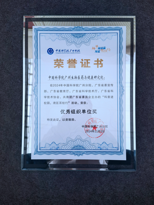 活動現(xiàn)場還頒發(fā)了“中國科學(xué)院科普進(jìn)校園灣區(qū)百校行”優(yōu)秀組織獎,廣州健康院榮獲此獎項(xiàng)。