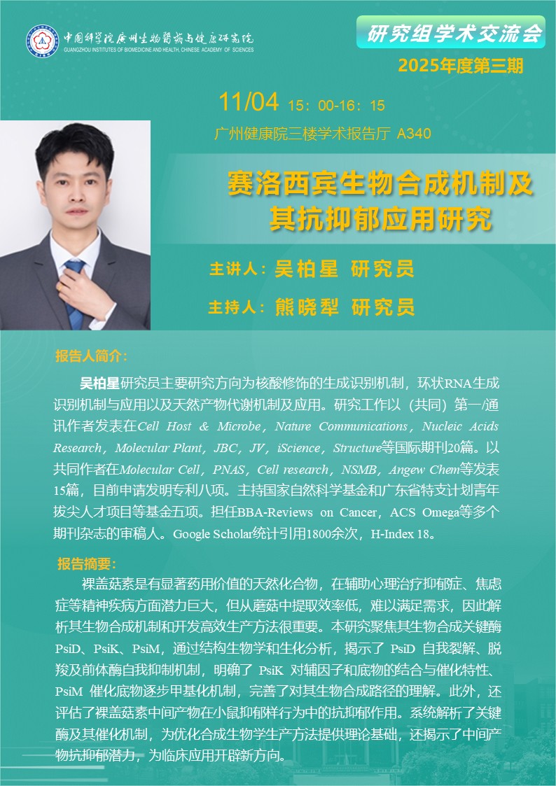 2025年4月11日研究組學(xué)術(shù)交流會(huì)(2025年度第三期):賽洛西賓生物合成機(jī)制及其抗抑郁應(yīng)用研究