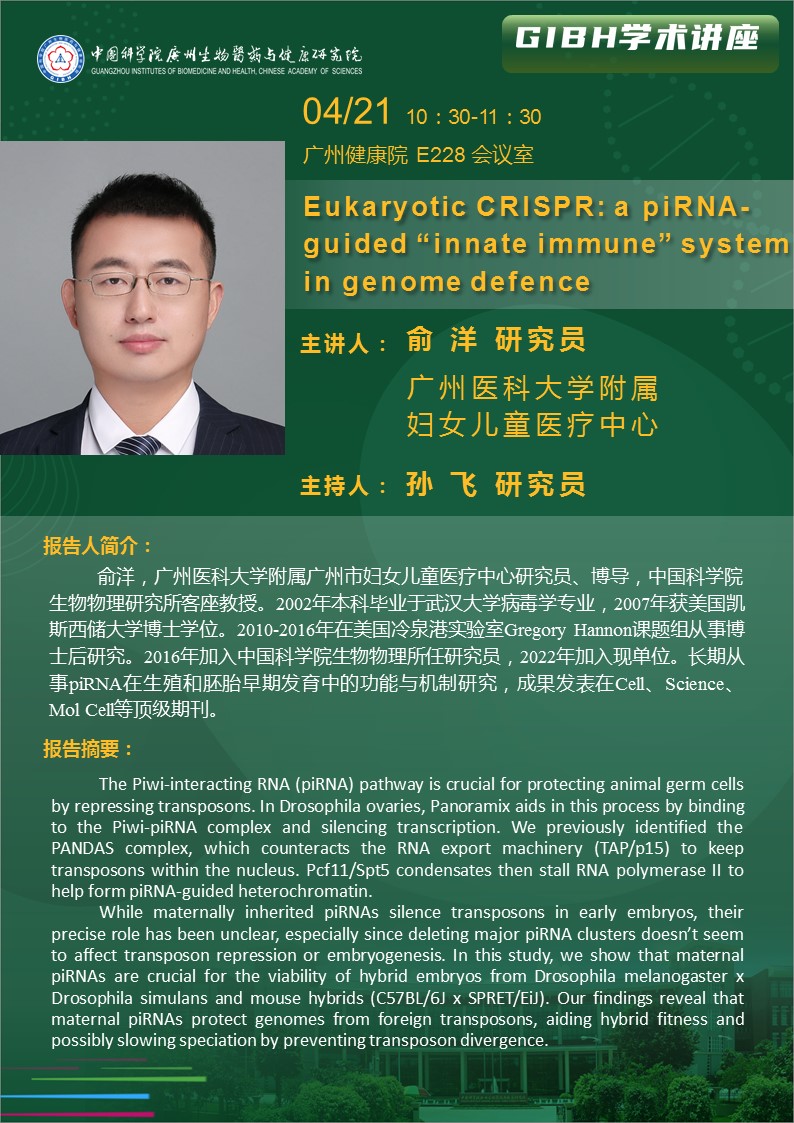 2025年4月21日學術講座:Eukaryotic CRISPR: a piRNA-guided “innate immune”system in genome defence
